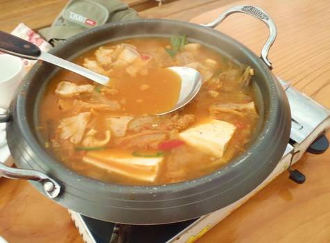 Подавши документи до тайського консульства, ми пішли досліджувати лаоську кухню. Я замовила шматки бекону із сиром тофу, грибами, капустою та зеленню. Все це мало неймовірний вигляд і підігрівалося на вогні. На жаль, на смак виявилося дуже гострим, що зіпсувало і настрій, і апетит.