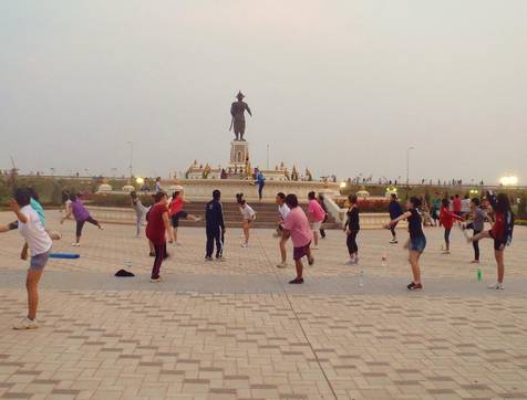 І в Таїланді, і, як виявилося, в Лаосі дуже поширений фітнес на відкритому повітрі. Дівчата з хлопцями збираються на просторих площах і разом із тренером та під гучну музику роблять різноманітні вправи.