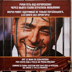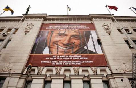 Харківська відсіч "пихатому Риму": на фасаді будівлі місцевої міськради вивісили звернення до мерії Риму. На ньому - фото екс-прем'єра Італії Сільвіо Берлусконі і текст "Руки геть від Берлусконі! Через нього Італія втратила мільйони! Мерія Риму! Підтримай не тільки українського, але й свого екс-прем'єра!".