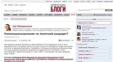У своєму блозі 17 жовтня на інтернет-ресурсі «Українська правда» Ігор Мірошниченко обізвав Тетяну Монтян «провладним роялем в кущах».