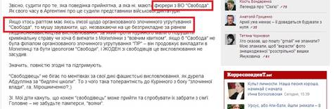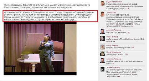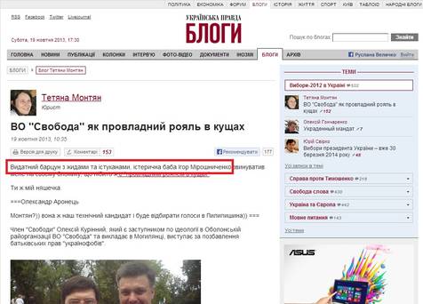 А вже 19 жовтня Тетяна Монтян у блозі на тому ж ресурсі обізвала Мірошниченка: «видатний барцун з жидами та істуканами, істерична баба Ігор Мірошниченко», а представників партії - «фюрери з ВО «Свобода» та підсумувала, що Всеукраїнське об’єднання «Свобода» є «організованим злочинним угрупуванням».