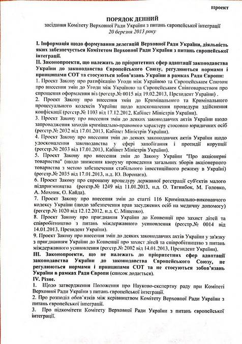 Сьогодні була остання дата, коли мало б відбутись планове засідання Комітету з питань європейської інтеграції напередодні приїзду 28.03.13 моніторингової місії Кокса - Кваснєвського для перевірки виконання зобов’язань України перед ЄС, серед яких затвердження дати виборів в п’яти виборчих округах та м. Києві; проведення реформ в судовій системі та інших.