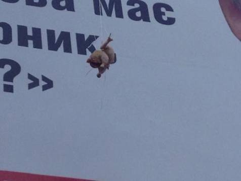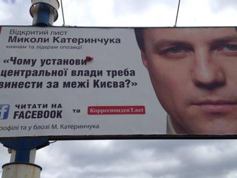 Сьогодні, 29 квітня вранці на бордах кандидата в мери Києва Миколи Катеринчука з'явилися курячі тушки, забруднені в червону фарбу.