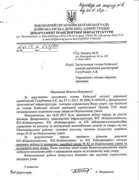 08.10.2012 була отримана відповідь від Головного управління транспорту та зв'язку, яка спільно з "Київміськсвітлом" та "Київпастрансом" опрацювала звернення стосовно опори №42 та № 50 і по результатам була демонтована опора № 50, яка за словами Миколи Хомича перебувала у більш задовільному стані. Опора № 42 не була демонтована оскільки вирішуються технічним питання, йдеться у відповіді.