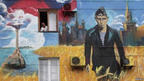 Житель оккупированного Севастополя выглядывает из окна, в стена его дома украшена путлеровским настенным рисунком. Май 2014 года.