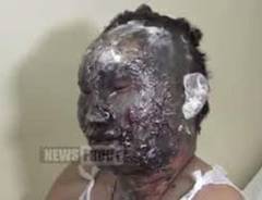 Лицо сожжено, обмотано бинтом, из-под бинта выступает кровь. Кисти рук тоже замотаны. Уши обгорели и съежились.