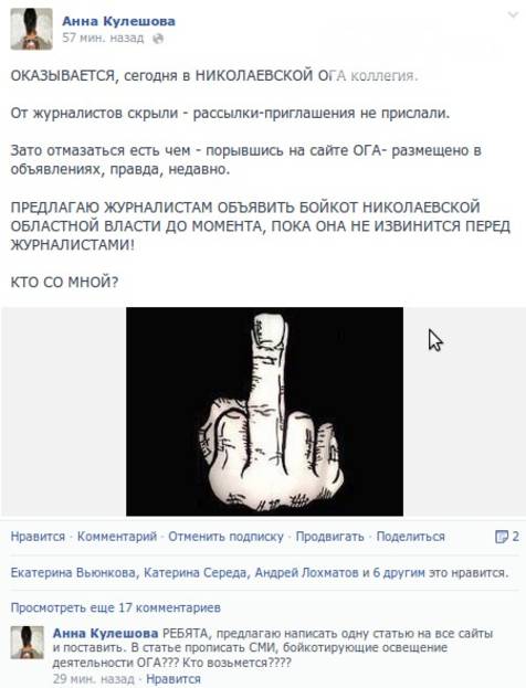 Журналісти Миколаєва вимагають від прес-служби Миколаївської ОДА ОФІЦІЙНО вибачитися і відмовляються висвітлювати діяльність Миколаївської облдержадміністрації до цього моменту.