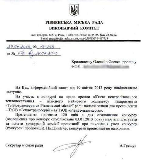 Рішення про передачу тепломереж «Теплотранссервісу» в оренду було прийняте за кілька днів до нового року, на останній сесії Рівненської міськради у грудні 2012-го. Оголошення про проведення конкурсу надрукували в муніципальній газеті «Сім днів», яка вийшла якраз під час новорічно-різдвяних свят. Саме тоді, коли одна частина українців знаходиться в стадії глибокого алкогольного сп’яніння. А інша (яка власне й могла б зацікавитись таким оголошенням) відпочиває на лижних курортах Європи, або гріється на теплих пляжах екзотичних країн. От і виходить, що про ДУЖЕ ЦІКАВИЙ конкурс розповіли переважно пенсіонерам (основна аудиторія муніципальної газети) в той час коли українці газет не читають.