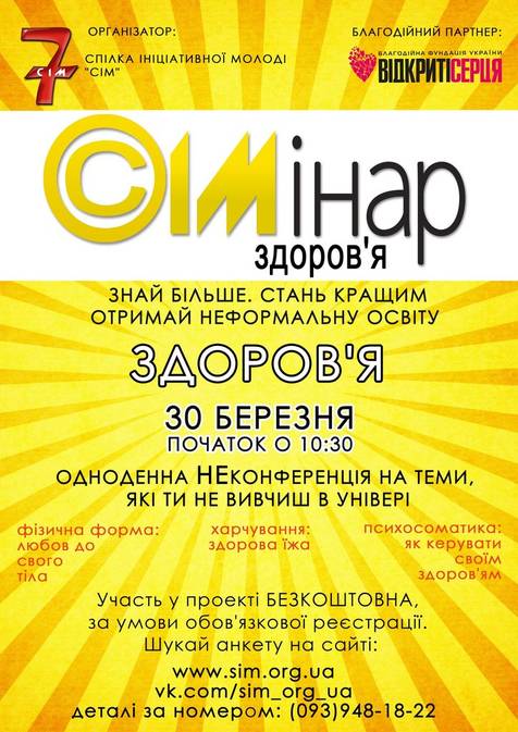 30 березня, вже в цю суботу, відбудеться третій безкоштовний СІМінар від СІМ - "СІМінар: здоров'я". Організатор: Спілка Ініціативної Молоді «СІМ». Благодійний партнер “Відкриті серця”