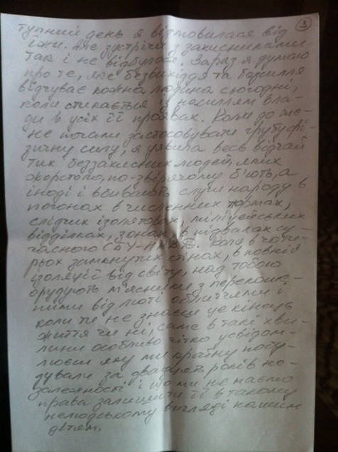 Коли до мене почали застосовувати грубу фізичну силу, я уявила весь відчай тих беззахисних людей, яких жорстоко, по-звірячому б’ють, а іноді і вбивають слуги народу в погонах в численних тюрмах, слідчих ізоляторах, міліцейських відділках, зонах, в підвалах сучасного СБУ-НКВС.