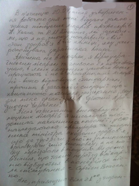 Після отримання висновку німецьких лікарів я письмово повідомила начальника колонії, усно наглядаючого прокурора та заступника міністра охорони здоров’я, що до зустрічі з моїм захисником, враховуючи зміст висновку, я не можу переїжджати в лікарню. Ми домовилися, що такий переїзд в лікарню відбудеться в понеділок після спілкування з Сергієм Власенком.