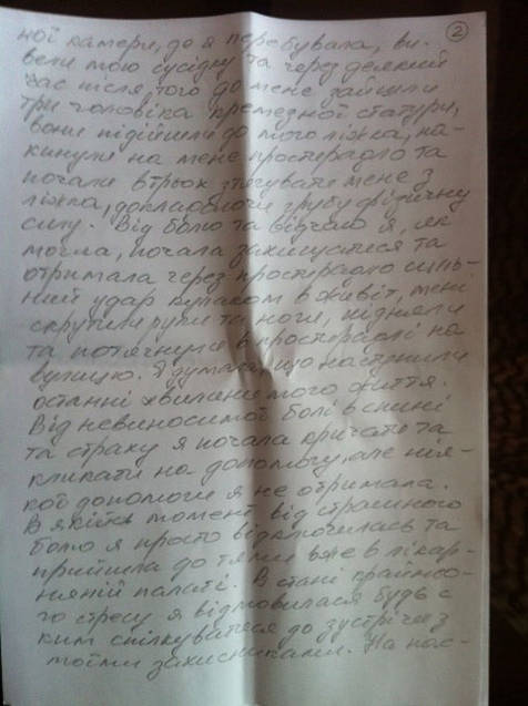 Але приблизно біля 21.00 з тюремної камери, де я перебувала, вивели мою сусідку, а через деякий час після того до мене зайшли 3 чоловіки кремезної статури. Вони підійшли до мого ліжка, накинули на мене простирадло та почали втрьох стягувати з ліжка, докладаючи грубу фізичну силу.