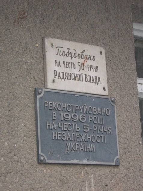 А еще насладиться двумя шикарными соседствующими табличками на главном корпусе: «Построено в честь 50-летия советской власти» и «Реконструировано в честь 5-летия независимости Украины». Жизненно и остроумно, однако.